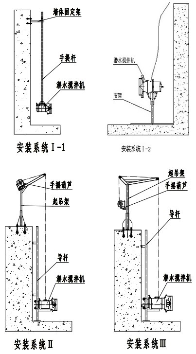 當池深H<4米時建議采用安裝系統(tǒng)一。潛水攪拌機的潛水深度可以根據(jù)需要進行垂直方向的調(diào)節(jié),而且在水平賣弄內(nèi)可繞導桿旋轉(zhuǎn)的最大角度為正負60°起吊系統(tǒng)底座、支撐架和下托架與池的有關連接面均采用膨脹螺栓固定,無需預留孔。安裝系統(tǒng)二用導向鋼繩替代導桿,具有運輸方便,現(xiàn)場安裝簡單等特點。該系統(tǒng)從根本避免了由于運輸引起導桿彎曲的、變形從而影響正常使用的情況,并有效改善了池深過深情況下,由于導桿的安裝誤差而導致的無法正常起吊等現(xiàn)象。在有懸臂池頂?shù)陌惭b條件下更顯得操作方便可靠。